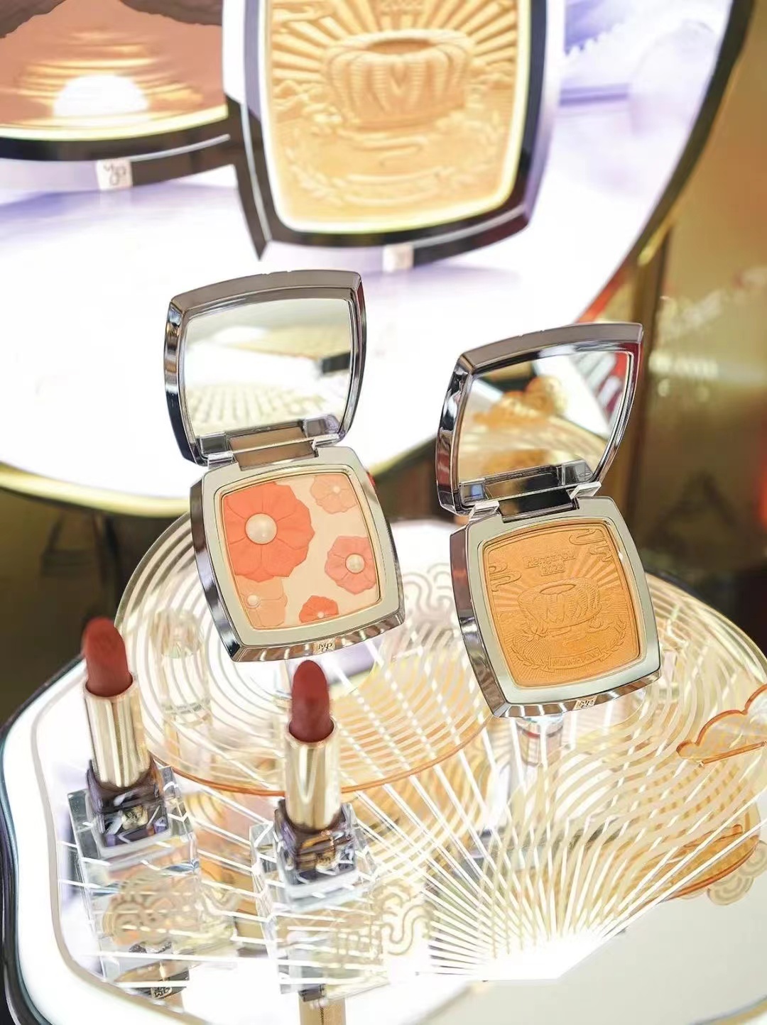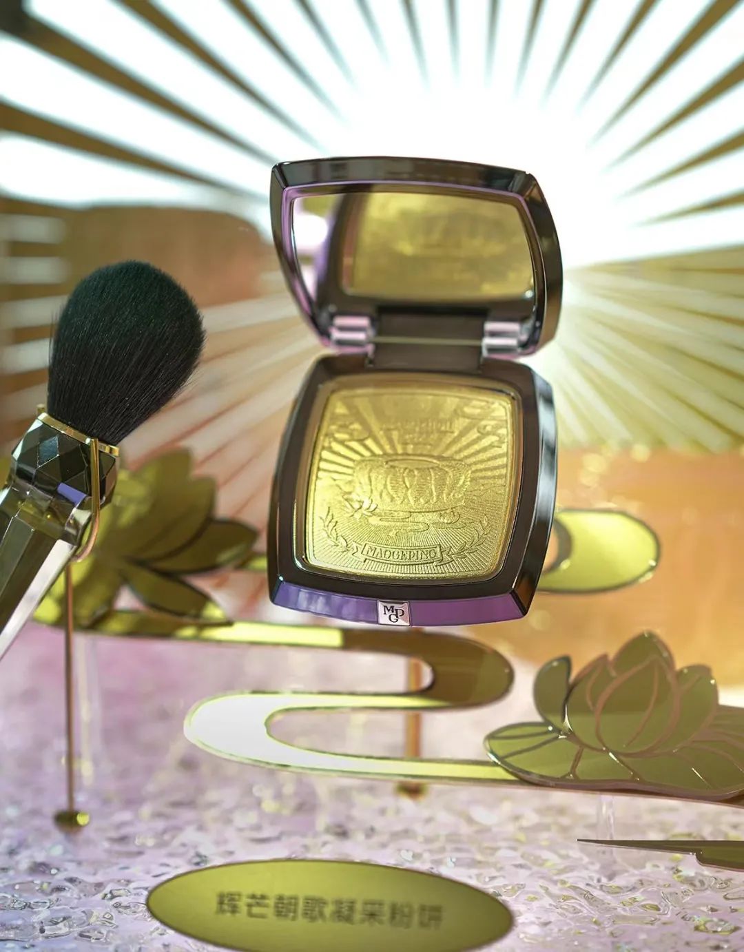 又如辉芒朝歌凝采粉饼内,印有杭州亚运会主场馆“大莲花”剪影,搭配莲花、山景与飘带云纹,并以金牌点缀,预祝体育健儿为国争光,更是对亚运会的致敬与展望。